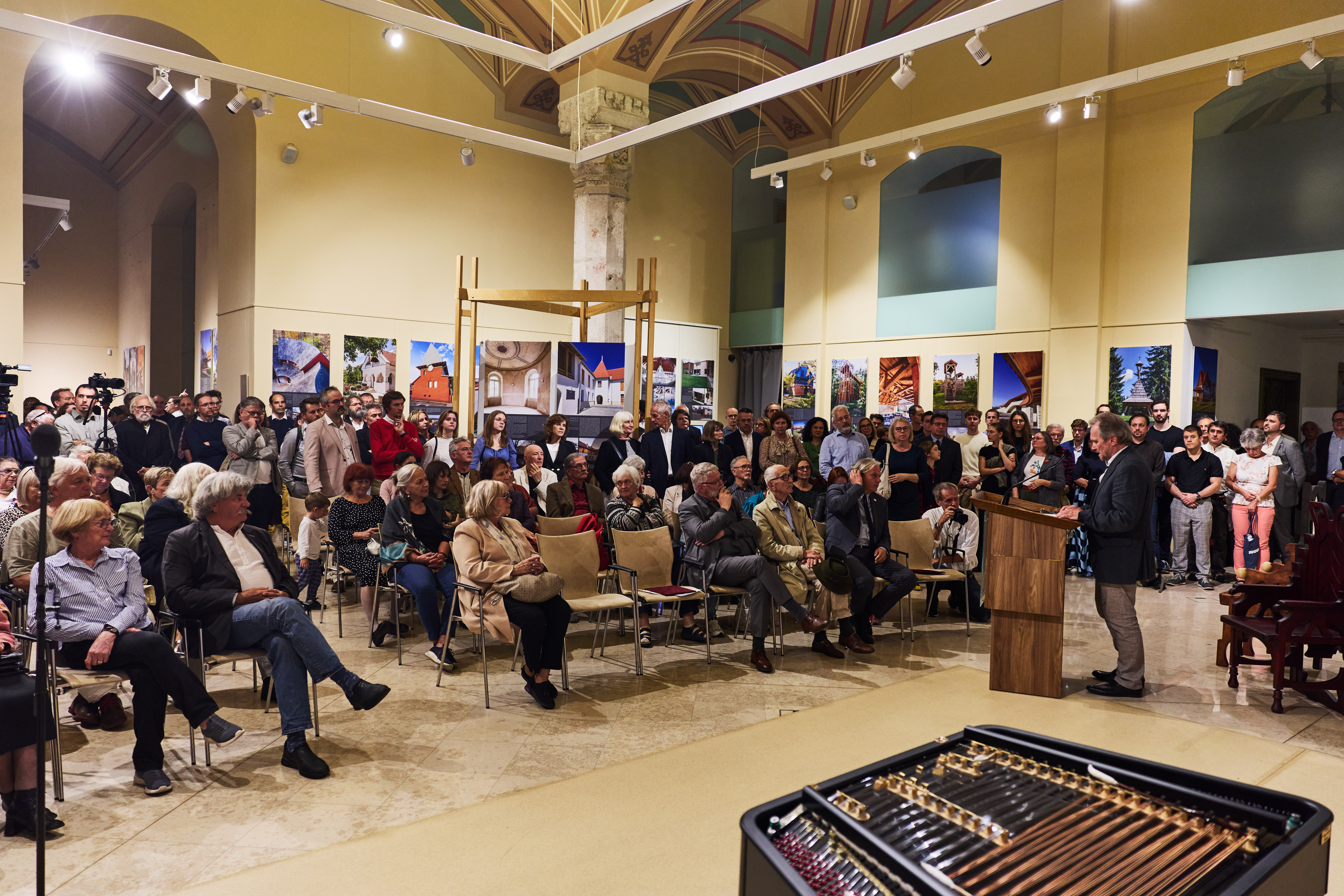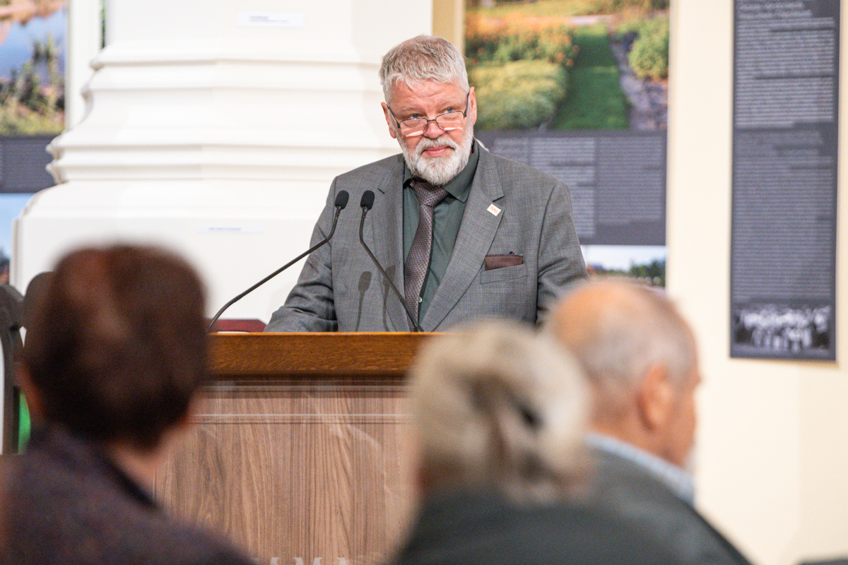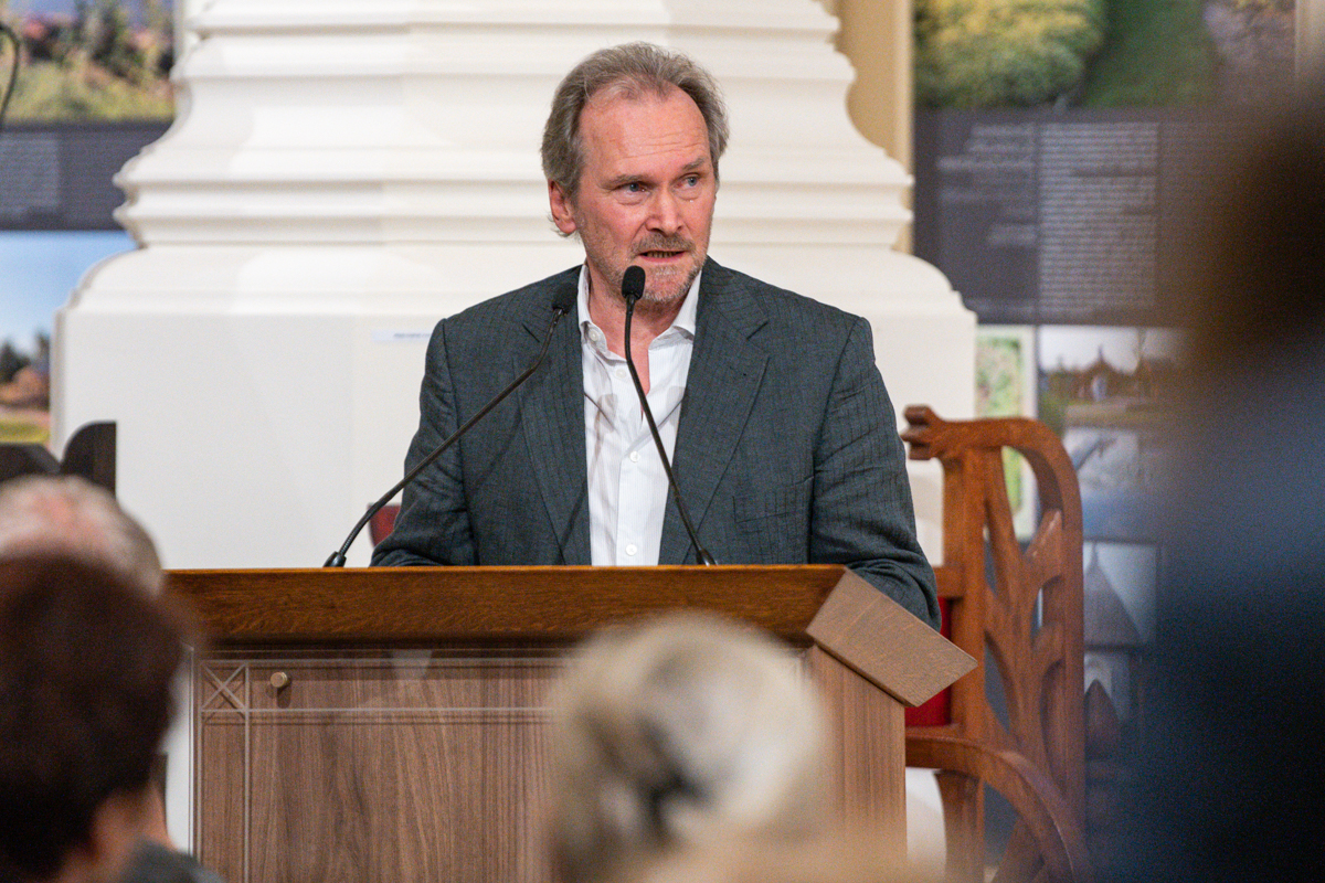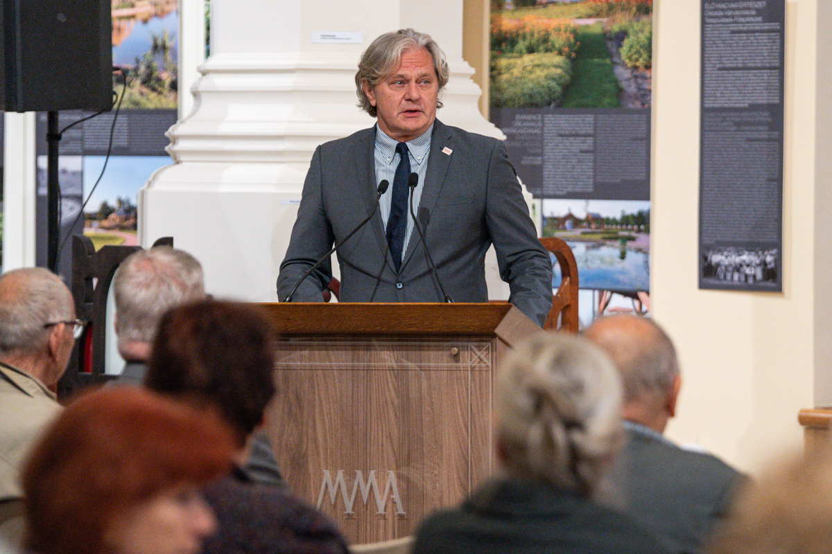 Rátóti Zoltán színművész, az MMA alelnöke megnyitó beszédében az építés ösztönének ősi gyökereiről szólt. Mint mondta: az építészet a kreativitás, a felelősség, a lélek- és anyagtisztelet legnemesebb kifejezése, amely nemcsak formákat, hanem közösségeket is teremt. „Építeni annyi, mint közösséget alapítani" – hangsúlyozta, hozzátéve, hogy az országépítés legfontosabb terepe nem kívül, hanem belül, az emberi lélekben van; „határtalan országépítés" pedig nem térképek és határok kérdése: ez belső alkotás, felelősség, értékteremtés és egymás iránti figyelem, hiszen a világ formálása önmagunk formálásával kezdődik.